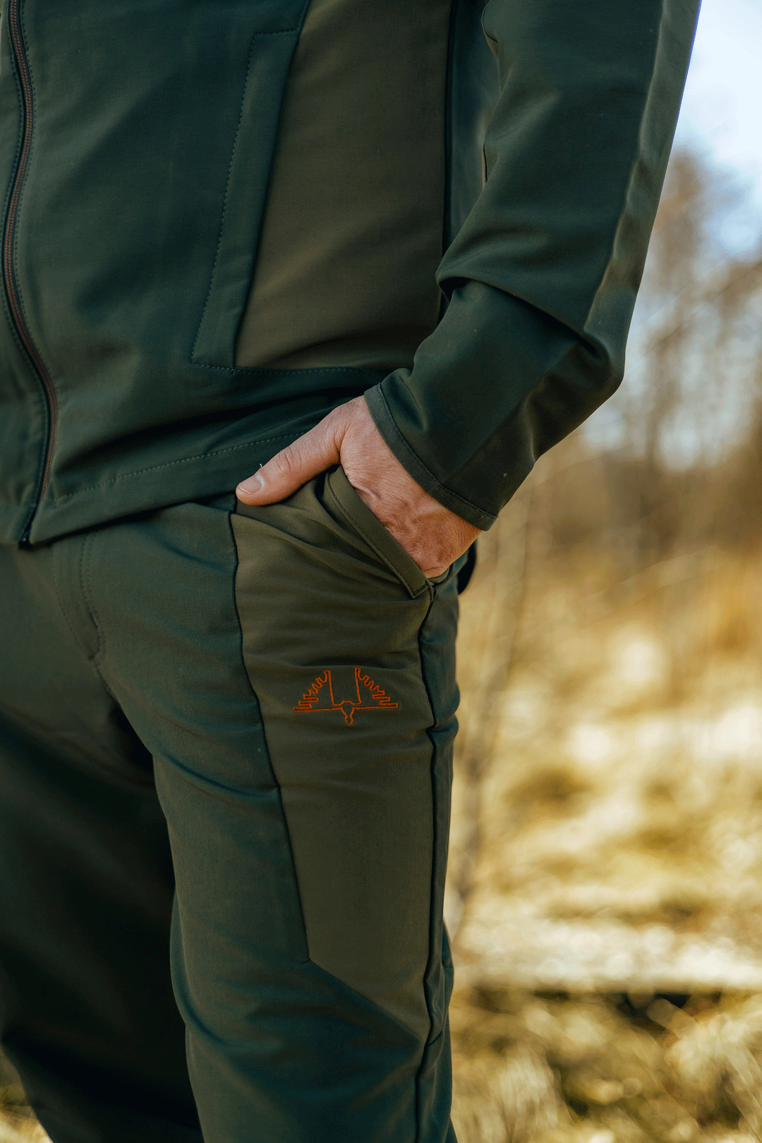 Lightweight and comfortable jacket and pants in four-way stretch fabric for hunting and outdoor activities.