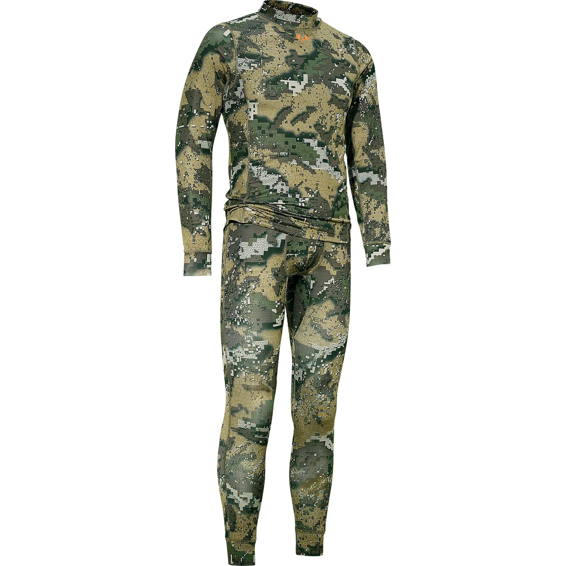 Rundhalset genser med tettsittende passform som sitter tett inntil kroppen. Lange underbukser med høy linning for å hindre at de sklir bak. Laget med det unike DESOLVE® Veil-kamuflasjemønsteret.